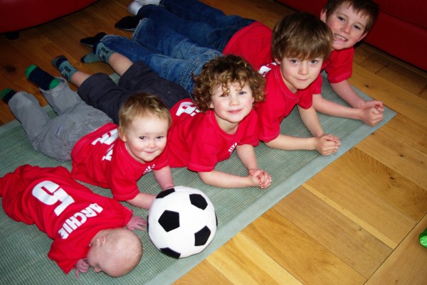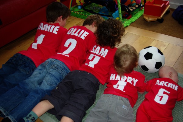 Yesterday Hilary’s Mum and Dad came to see us with Auntie Heather and they brought with them an amazing present that Hilary’s cousins had made for the boys. Bearing in mind that the first question anyone asks when you say you have five boys is something about a 5 a side football team, Frances (Hilary’s cousin) and her husband Paul put together a lovely little team strip for the boys to wear.